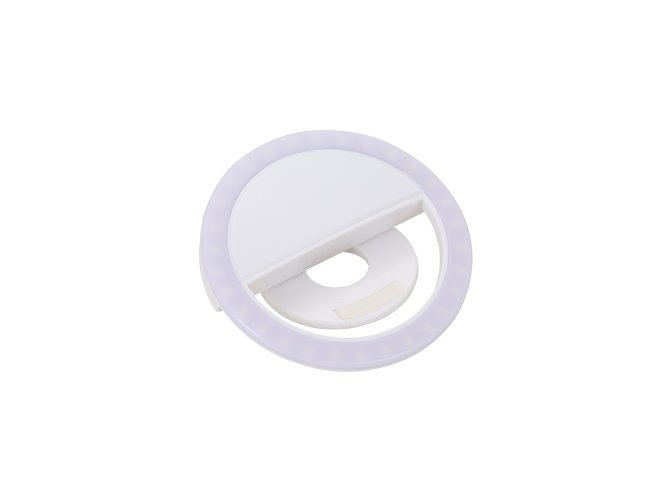Anel de iluminação para celular, utilizado para fotos em formato selfie. “Ring light” plástico no formato “presilha” para encaixe, possui três estágios de iluminação acionados pelo botão superior. Acompanha cabo USB para carregamento.