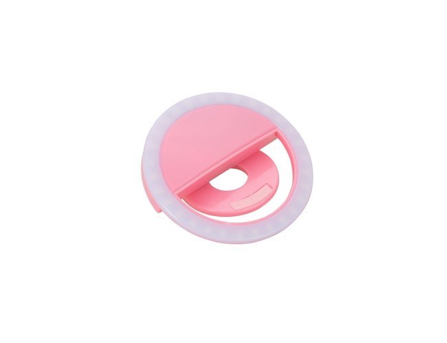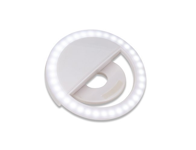 Anel de iluminação para celular, utilizado para fotos em formato selfie. “Ring light” plástico no formato “presilha” para encaixe, possui três estágios de iluminação acionados pelo botão superior. Acompanha cabo USB para carregamento.