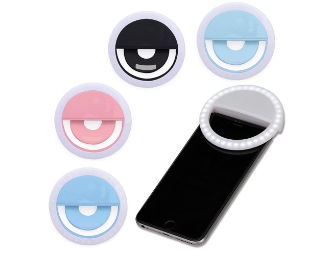 Anel de iluminação para celular, utilizado para fotos em formato selfie. “Ring light” plástico no formato “presilha” para encaixe, possui três estágios de iluminação acionados pelo botão superior. Acompanha cabo USB para carregamento.
