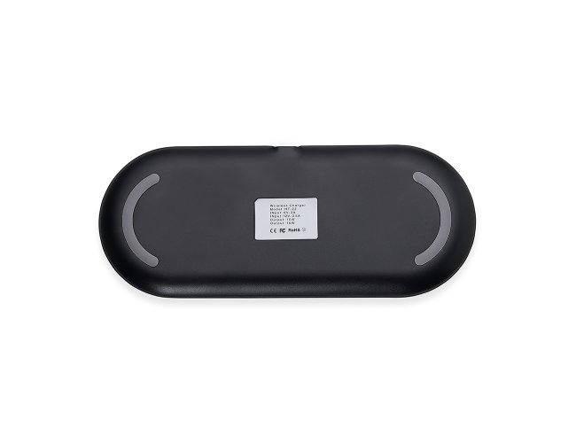 Base de carregamento por indução dual para celulares e Iwatch. Com “almofadas” de indução para o carregamento de celulares simultaneamente, a base contém na área central uma área indutiva para o carregamento de Iwatch com luzes leds indicativas de funcionamento. Para maior estabilidade em superfícies, a base possui borrachas antideslizantes na área inferior. Acompanha cabo USB Tipo-C.