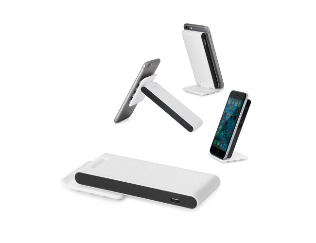Bateria portátil em ABS com ventosas na base. Bateria de lítio com capacidade de 4.000 mAh, tempo de vida ≥ 500 ciclos e com entrada/saída 5V/1A. Incluso cabo USB / micro USB para carregar a bateria. Bateria: 123 x 50 x 14 mm | Base: 65 x 58 x 10 mm.