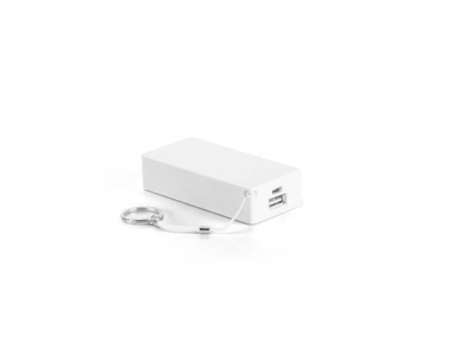 Bateria portátil em ABS. Bateria de lítio com capacidade de 4.000 mAh, tempo de vida ≥ 500 ciclos e com entrada/saída 5V/1A. Incluso cabo USB/micro USB para carregar a bateria. Dimensões :100 x 55 x 25 mm.