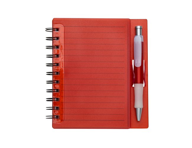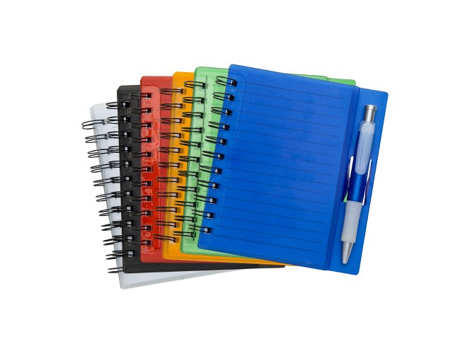 Bloco de anotações acrílico colorido com wire-o e caneta plástica. Possui aproximadamente 70 folhas brancas pautadas, caneta plástica colorida com detalhes em branco(acionador e ponteira prata). observação: Bloco 16,1 cm x 14,8 cm – Caneta 13,4 cm x 1,7 cm