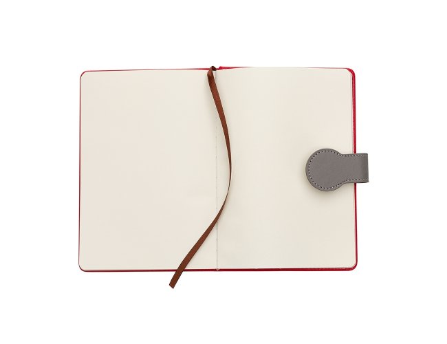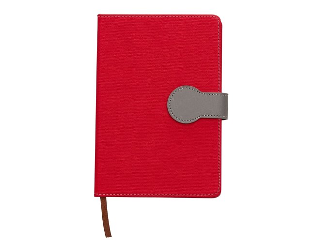 Bloco de anotações com fechamento imantado. Capa produzida em tecido sintético texturizado, contém aproximadamente 96 folhas amarelas sem pauta e marcador de página em cetim.