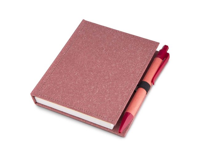 Bloco de anotações em papelão reciclado com capa dura, miolo com 100 folhas, sticky notes e miolo sem pauta na cor branca.