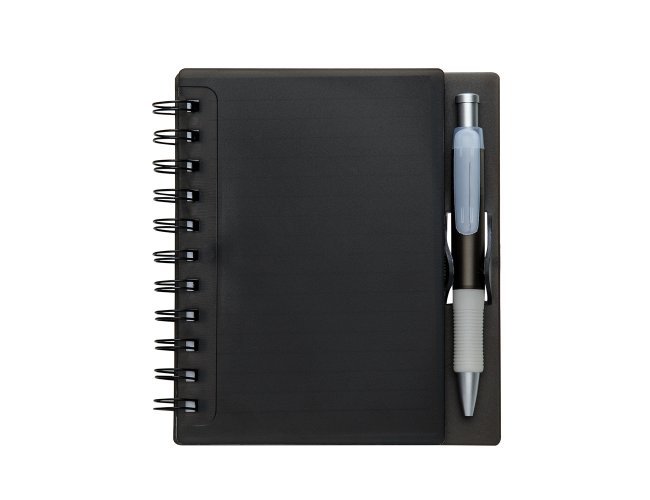 Bloco de anotações acrílico colorido com wire-o e caneta plástica. Possui aproximadamente 70 folhas brancas pautadas, caneta plástica colorida com detalhes em branco(acionador e ponteira prata). observação: Bloco 16,1 cm x 14,8 cm – Caneta 13,4 cm x 1,7 cm
