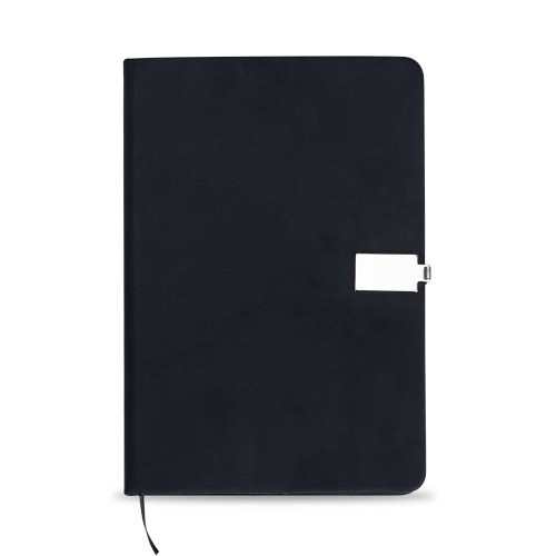 Bloco de anotações estilo moleskine emborrachado com fecho metálico imantado. Possui aproximadamente 96 folhas amarelas pautadas e marca página de cetim.