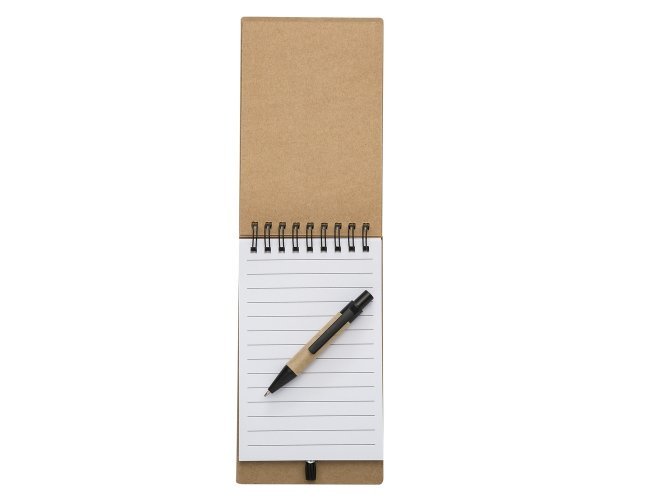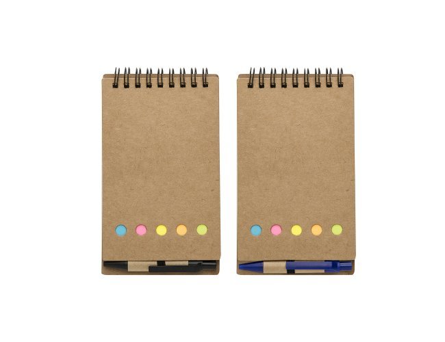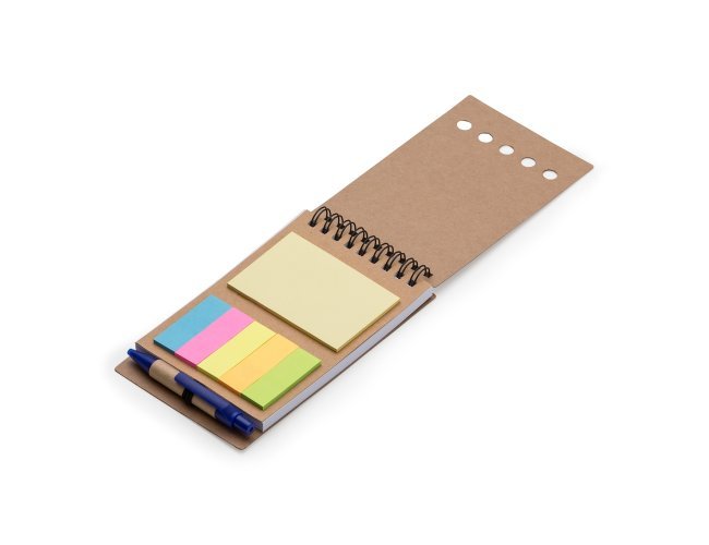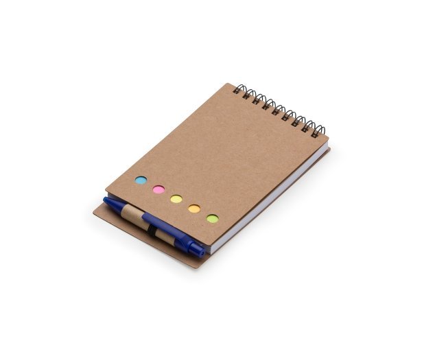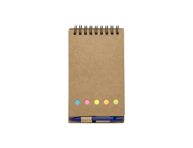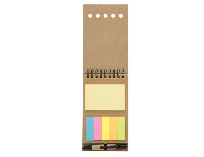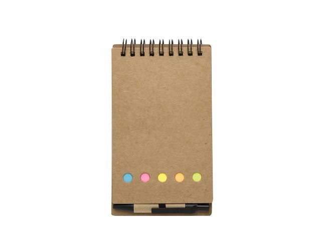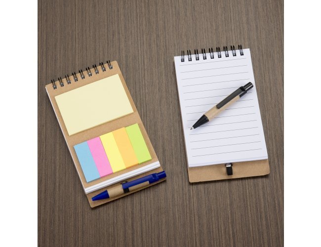 Bloco de anotações ecológico com espiral, material em kraft. Possui uma mini caneta de papelão com acabamentos plásticos acionada por clique, cinco blocos autoadesivos coloridos, um bloco de autoadesivo amarelo e um bloco com aproximadamente 70 folhas brancas pautadas.