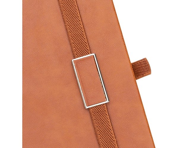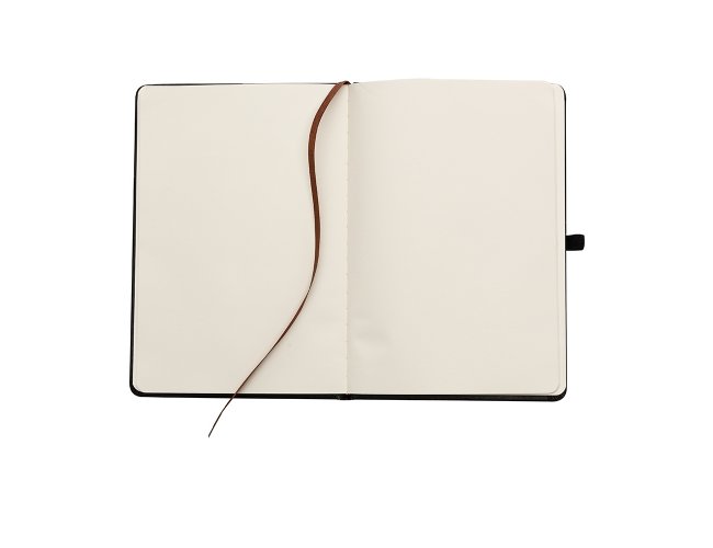 Bloco de anotações emborrachado com suporte para caneta. Contém aproximadamente 96 folhas amarelas sem pauta, suporte de nylon para caneta (não acompanha), marcador de página em cetim e elástico para lacre com plaquinha de centro emborrachado.