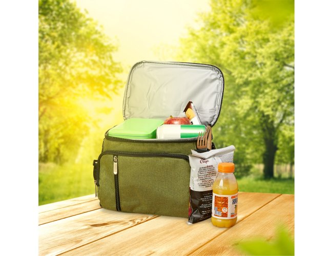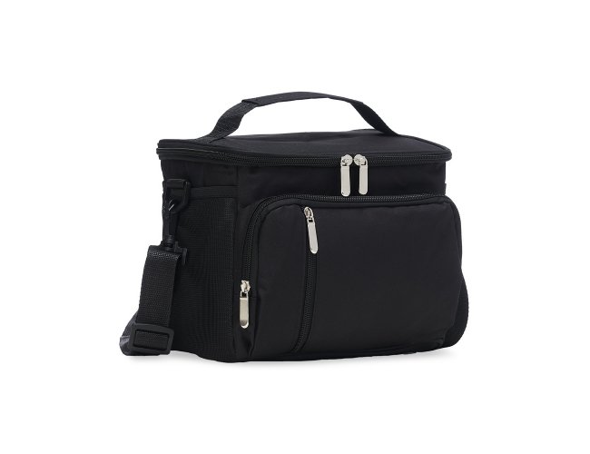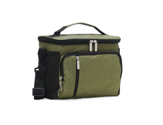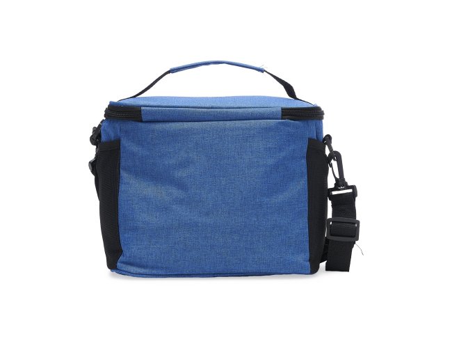 Descrição: Bolsa térmica de poliéster com três compartimentos, capacidade de 9 litros. A bolsa possui revestimento térmico em PEVA atóxico com costura soldada (não vaza), alça de mão, bolsos laterais telados e acompanha alça transversal.