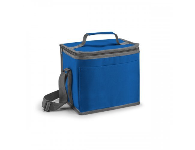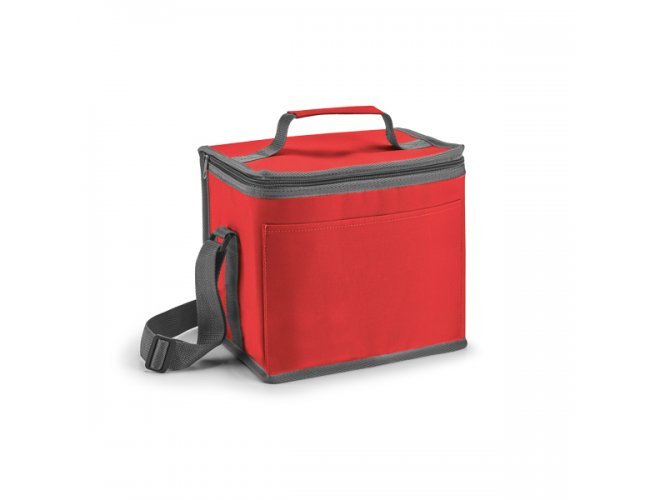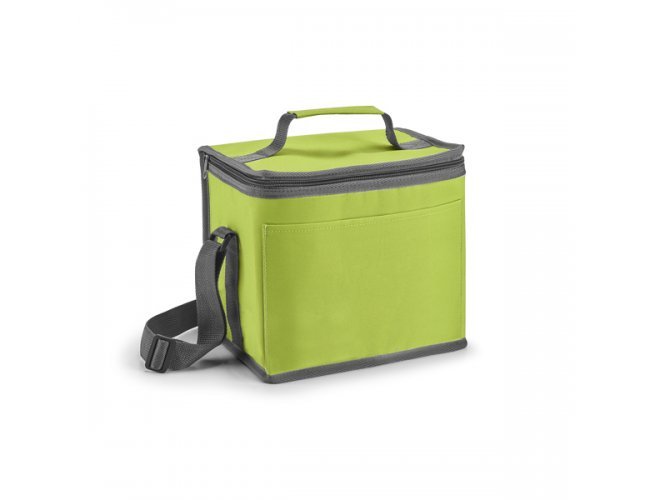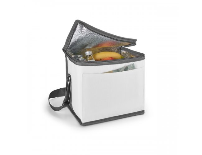 Bolsa térmica. 600D. Com alça ajustável em webbing e bolso frontal. Capacidade até 9 litros. Food grade. 240 x 220 x 170 mm