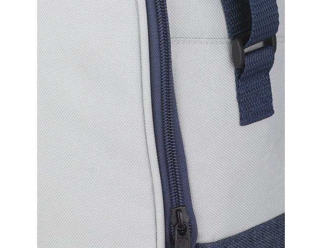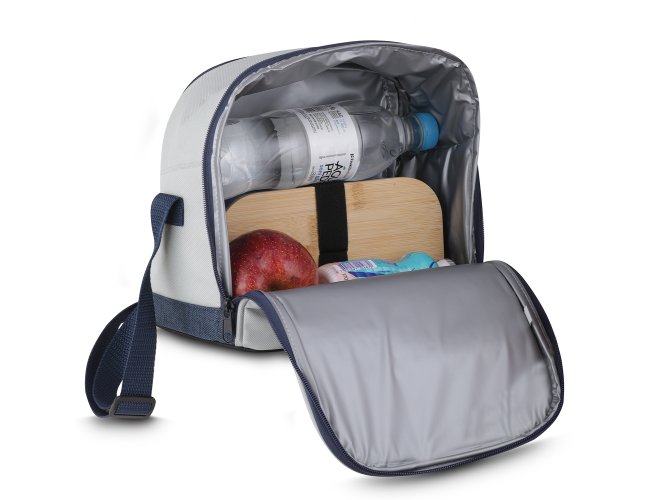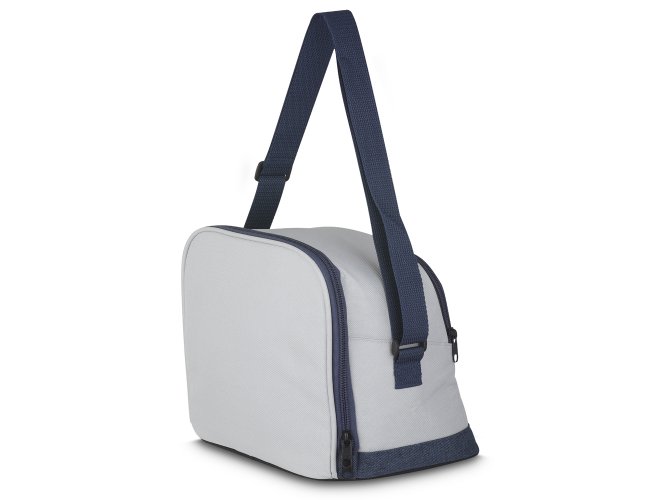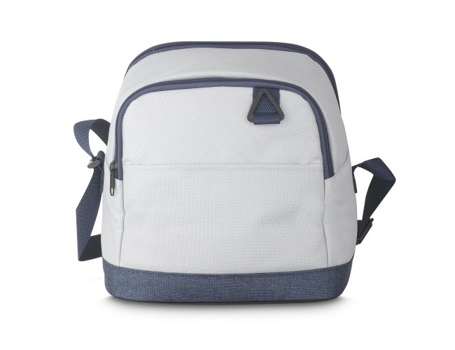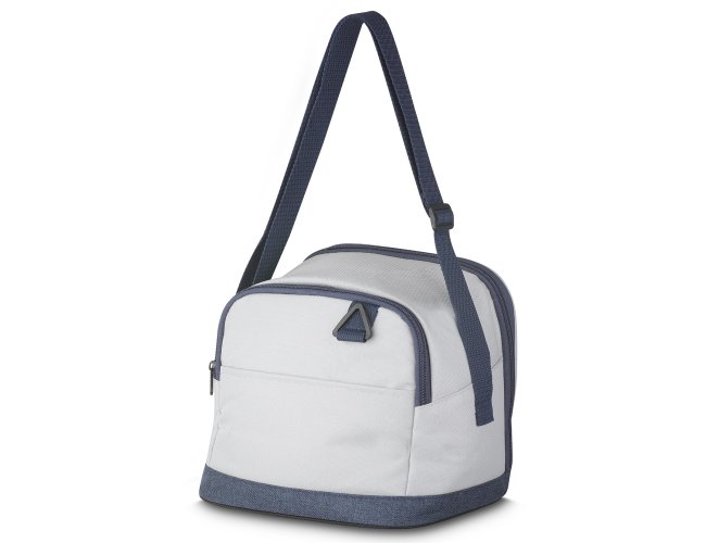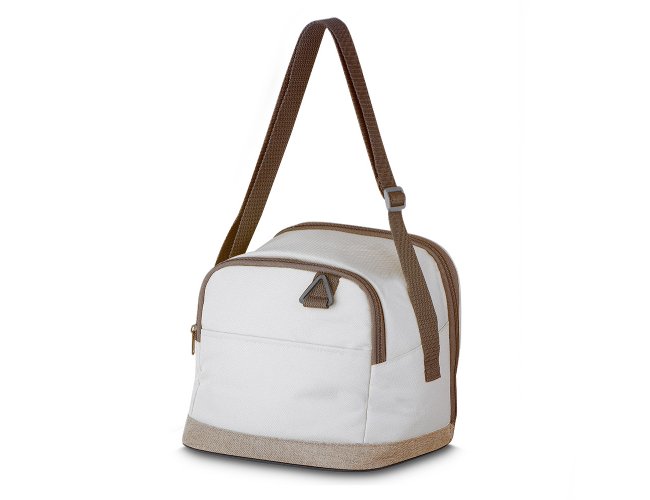 Bolsa térmica em tecido poliéster 600D com bolso frontal , argola plástica para chave e dois acessos ao compartimento interno. Possui alça de transporte com regulagem e parte interna soldada para melhor conservação térmica.