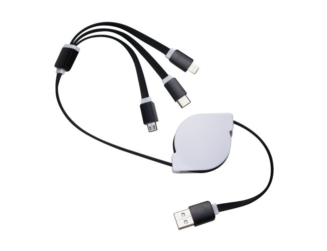 Cabo USB retrátil 3 em 1 (não transfere arquivos). Entrada Lightning: Iphone, Ipad e Ipod; Entrada Micro USB: smartphones e tablets Android; Entrada Micro USB-C: modelos mais recentes de smartphones e tablets Android. Suporte plástico branco de frente lisa e verso com detalhe oval (com parafuso no centro). Possui rolamento com trava automática, os dois lados de cabo devem ser puxados simultaneamente e ao soltar irão travar. Não puxar um cabo por vez para não embolar.