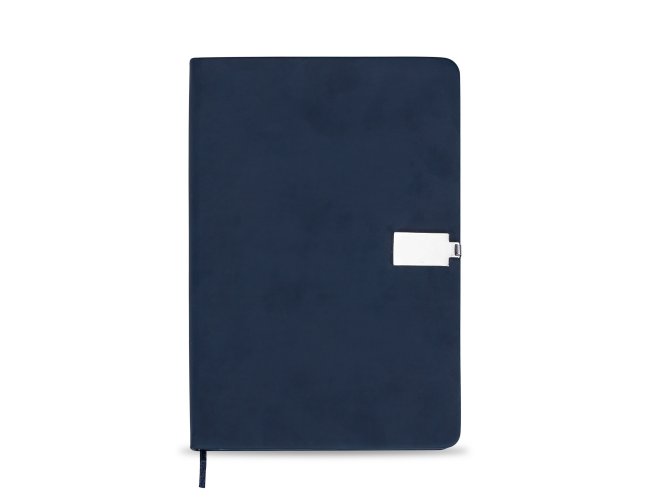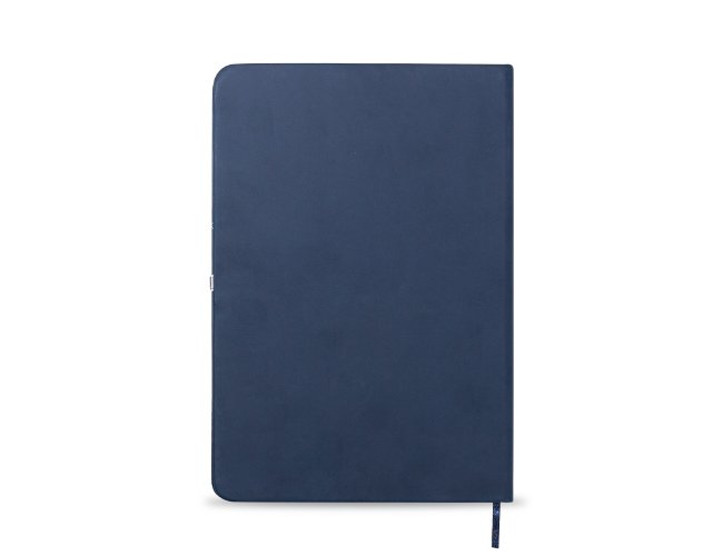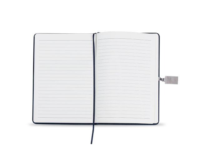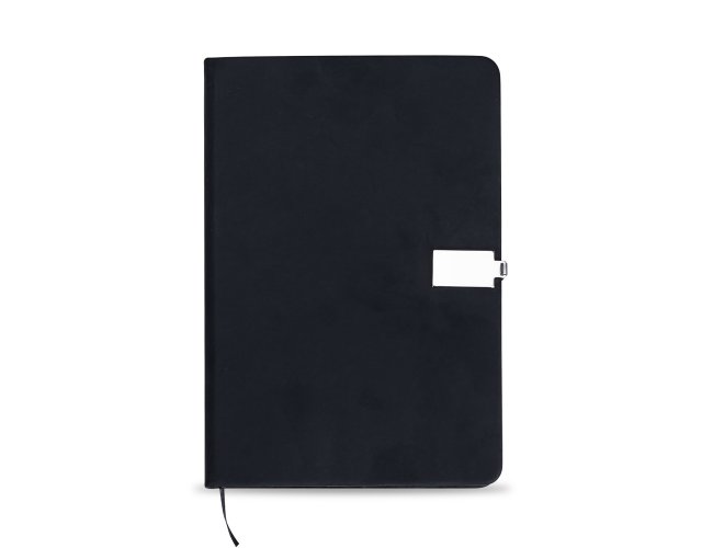 Caderneta emborrachada com fecho metálico imantado. Possui aproximadamente 96 folhas amarelas pautadas e marca página de cetim.