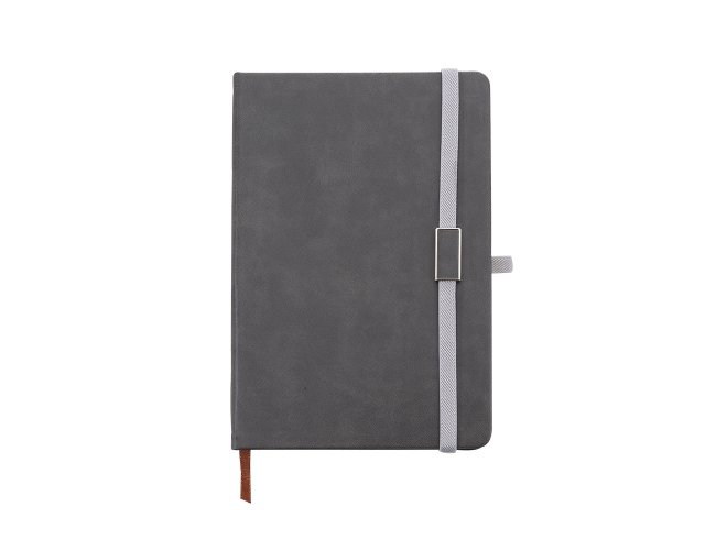 Caderneta emborrachada com suporte para caneta. Contém aproximadamente 96 folhas amarelas sem pauta, suporte de nylon para caneta (não acompanha), marcador de página em cetim e elástico para lacre com plaquinha de centro emborrachado.