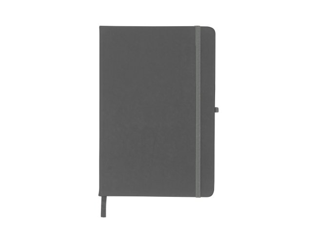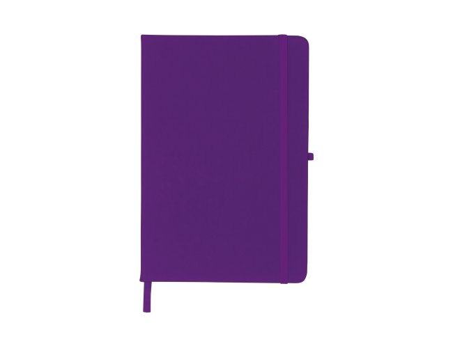 Caderneta emborrachada com porta caneta elástico em nylon, marcador de página em cetim e fita elástica de nylon para fechar. Contém aproximadamente 80 folhas pardas pautadas.