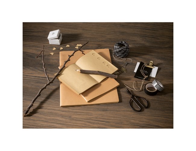 Caderno A5 com capa em cartão (250 g/m²) e cantos redondos. Contém 80 folhas não pautadas, costuradas, em papel reciclado proveniente de gestão florestal sustentável.