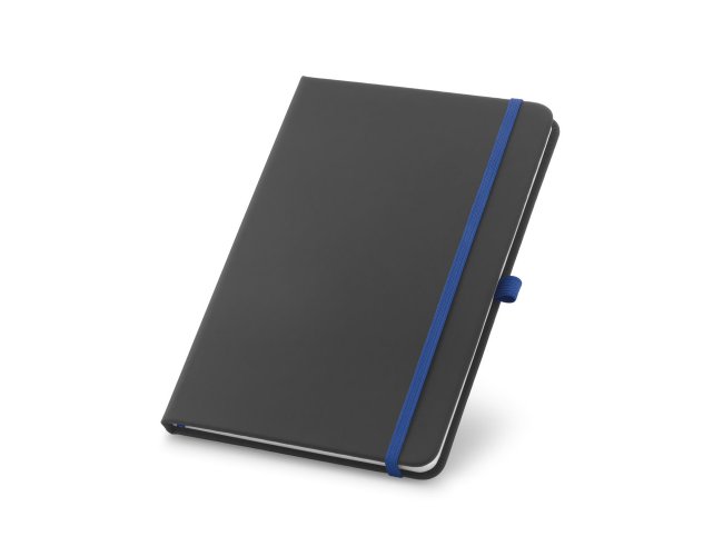 Caderno A5 em c. sintético com capa dura. Contém 80 folhas pautadas, fita separadora, elástico e suporte para esferográfica (não inclusa). 140 x 210 mm.