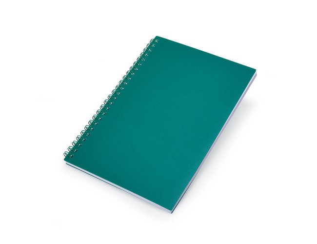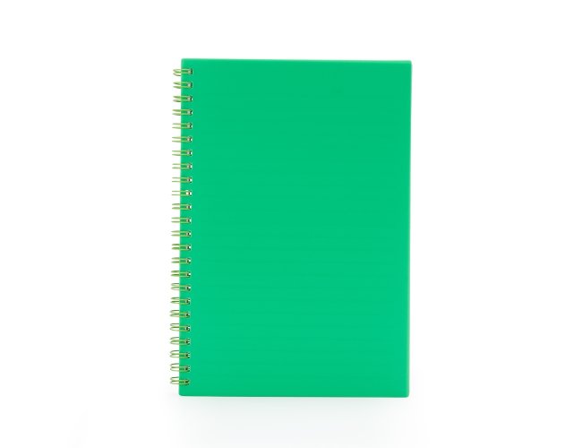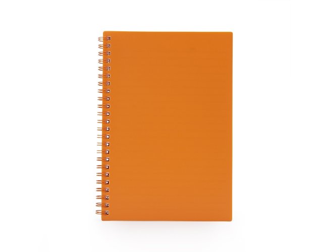 Caderno A5 plástico com wire-o metálico. Capa em PP, contém aproximadamente 80 folhas brancas com pauta.