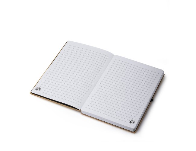Caderno de anotações com elástico e suporte para caneta, capa dura com 3mm em material reciclável com detalhes em bambu, miolo com 96 folhas pautadas na cor branca. Não acompanha caneta.
