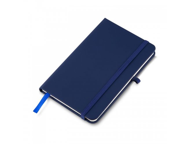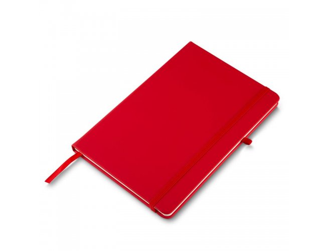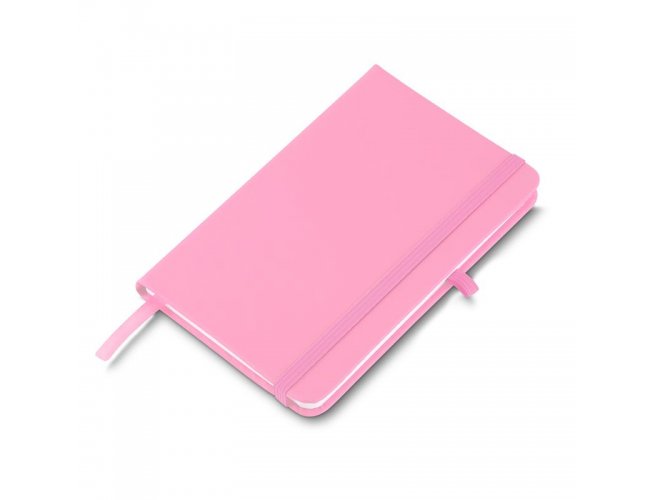 Caderno de anotações com elástico no tamanho A5, suporte para caneta, capa dura em material sintético, miolo 80 folhas pautadas na cor bege.