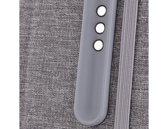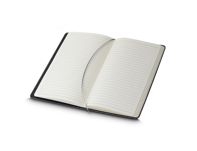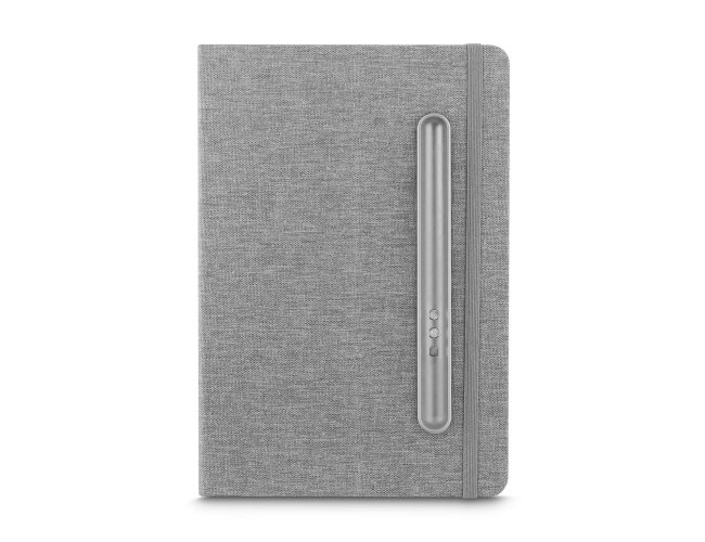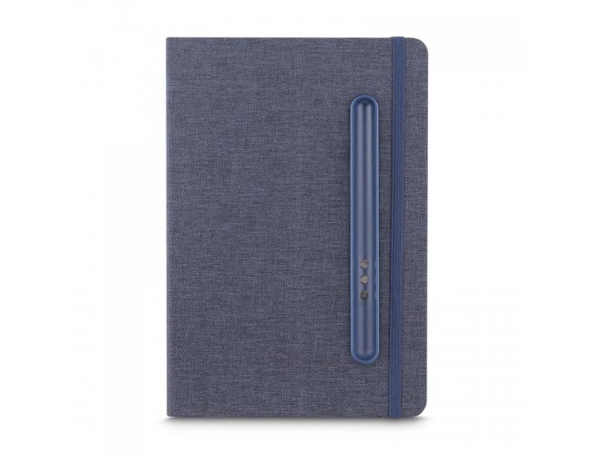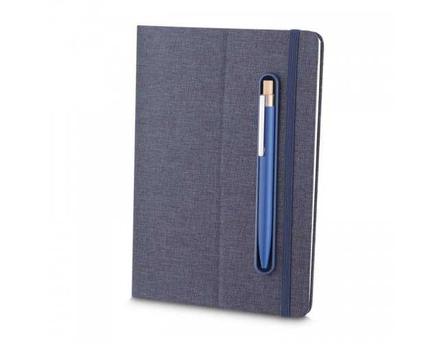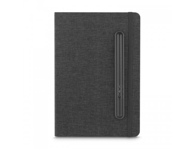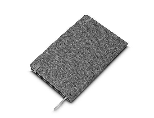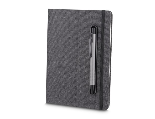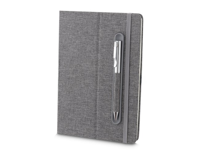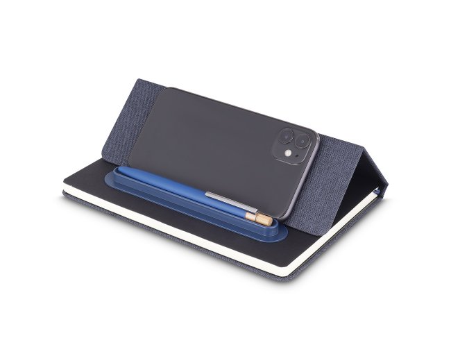 Caderno produzido com capa em tecido RPET e suporte para caneta na capa, capa dobrável para suporte de smartphone, miolo com 80 folhas pautadas.
