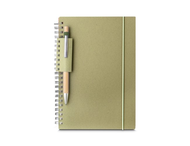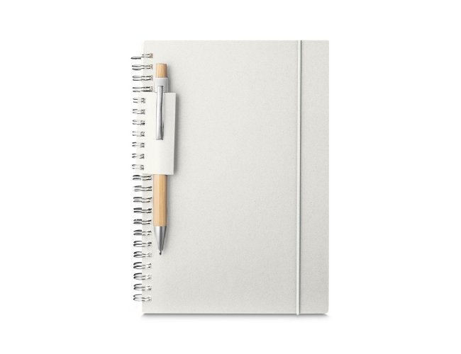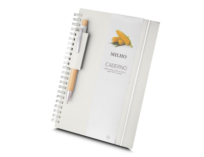 Com suporte para caneta em papel reciclável;