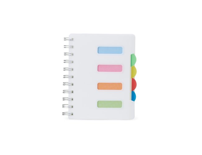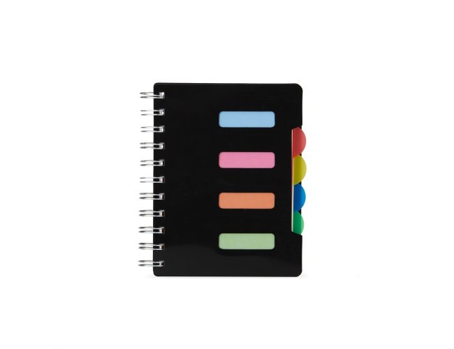 Caderno pequeno com 4 divisórias e abas para identificações, capa plástica com wire-o metálico. Contém aproximadamente 103 folhas marfins e folha inicial com tarjas para organizar e identificar as divisórias.