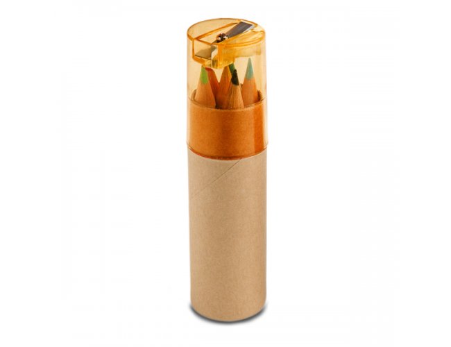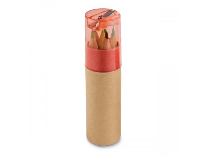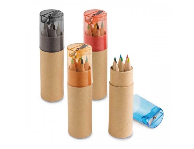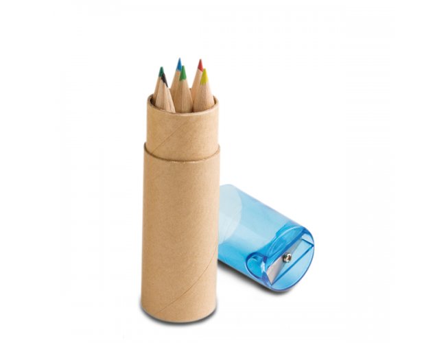 Caixa de cartão com 6 mini lápis de cor. Cartão e plástico. Com apontador. ø26 x 103 mm