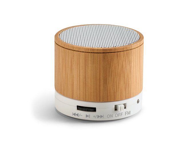 Caixa de som com microfone em bambu. Transmissão por bluetooth 3.0, ligação stereo 3,5 mm e leitor de cartões TF e potência de 3W (4Ω). Bateria com capacidade até 300 mAh e autonomia até 3 horas. Função para atender chamadas, controle de volume, conexão à playlist do dispositivo móvel e rádio FM. Incluso cabo USB / micro USB para carregar e cabo de áudio (Jack/Jack). Fornecida em caixa presente de papel craft. ø60 x 52 mm.