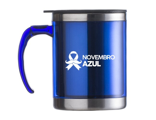 Caneca acrílica 400ml com detalhe oval no pegador, revestimento interno e detalhes em inox. Tampa plástica resistente com sistema giratório para abertura(não é térmica).
