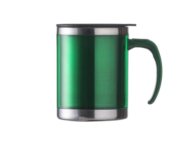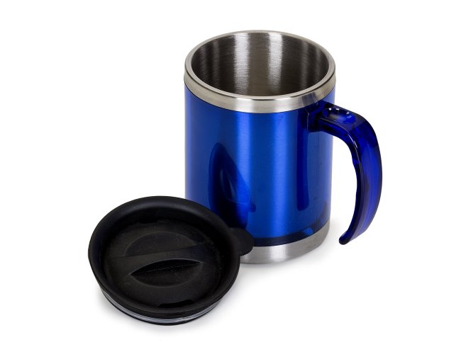 Caneca acrílica 400ml com detalhe oval no pegador, revestimento interno e detalhes em inox. Tampa plástica resistente com sistema giratório para abertura(não é térmica).