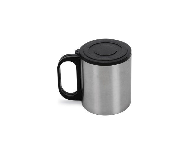 Caneca de inox 180ml com cabo e tampa em plástico resistente(não é térmica). Personalizada com a sua logomarca.