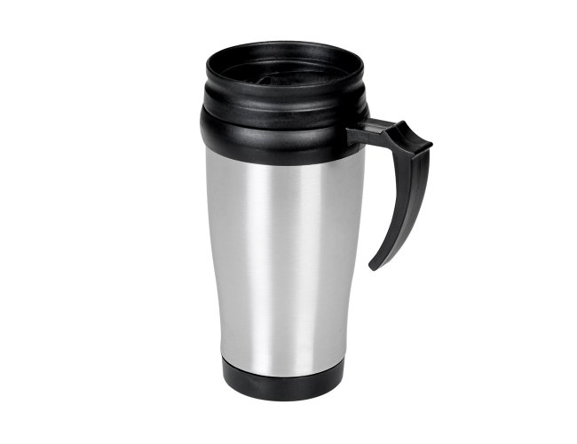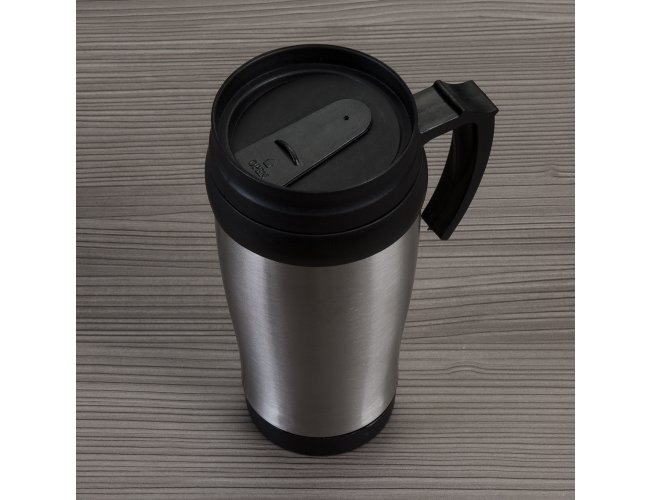 Caneca inox de 400ml revestida internamente com PVC, pegador e detalhes em plástico resistente. Tampa rosqueável, possui compartimento que pode ser aberto para beber(não é térmica).