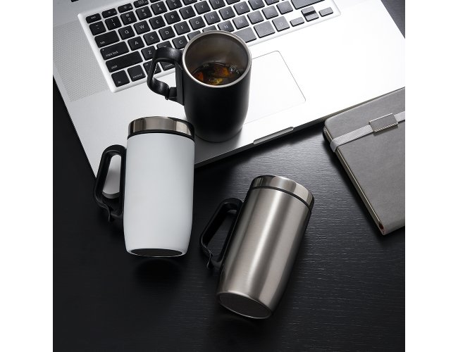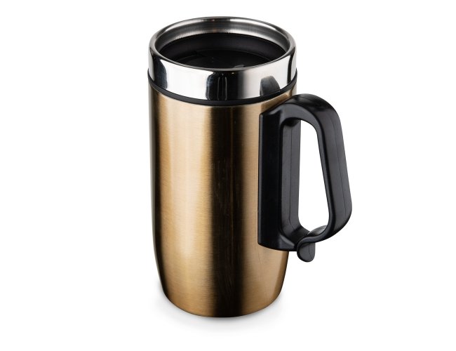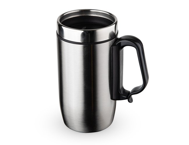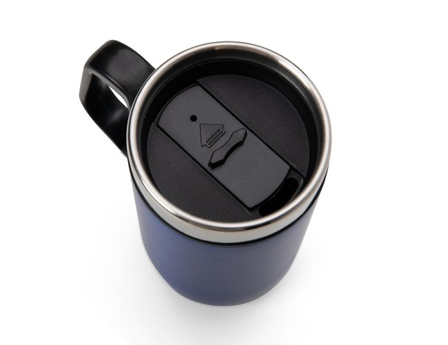 Caneca 250 ml parede dupla em Inox, com pegador de plástico, contém tampa com compartimento que ao deslizar, pode ser aberto para beber e base com EVA antiderrapante.