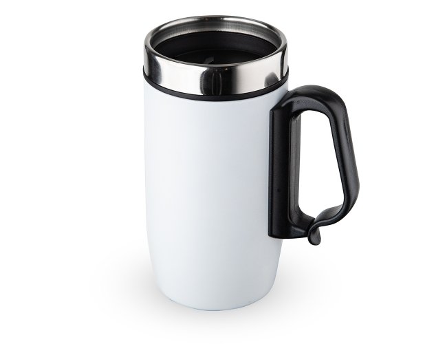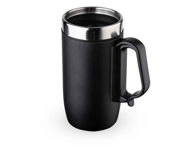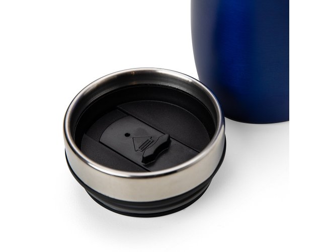 Caneca 250 ml parede dupla em Inox, com pegador de plástico, contém tampa com compartimento que ao deslizar, pode ser aberto para beber e base com EVA antiderrapante.