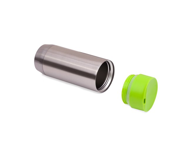 Caneca em aço inox com parede dupla isolada a vácuo com capacidade de até 450ml, conserva temperatura quente ou fria e tampa com vedação.
