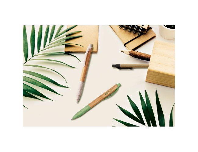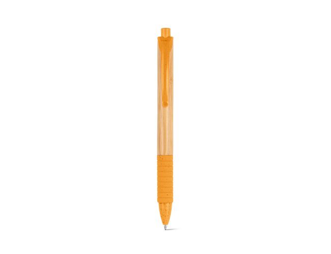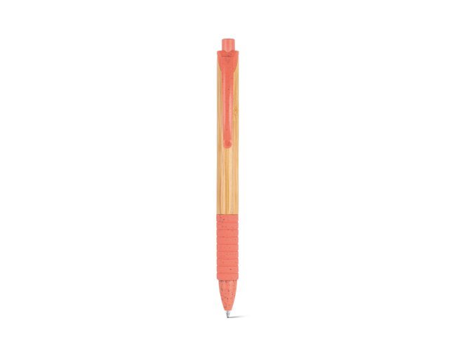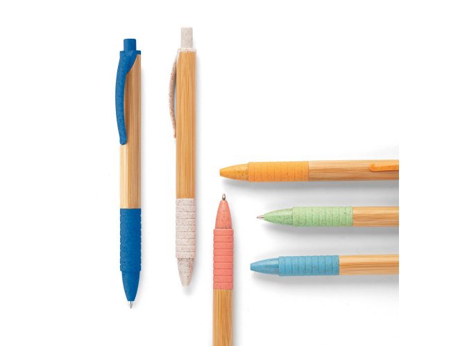 Esferográfica em bambu com clipe, antideslizante e elementos coloridos em fibra de trigo e ABS. Até 1,5 km de escrita. ø11 x 142 mm