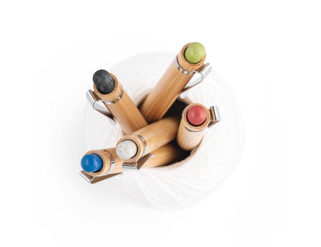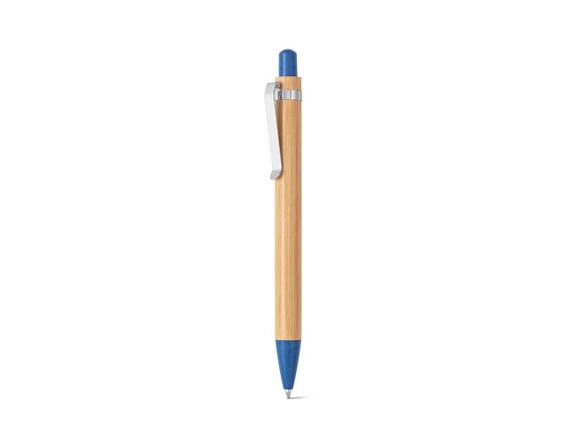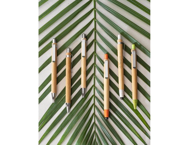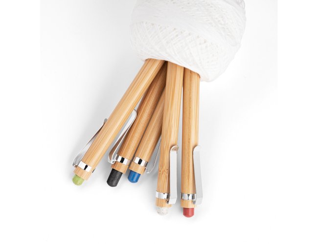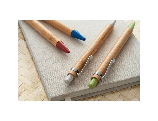 Esferográfica em bambu e clipe em metal. Os elementos coloridos são em fibra de trigo e ABS. Até 1,5 km de escrita. ø11x142 mm