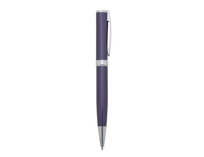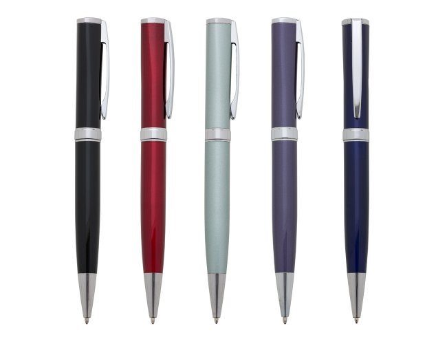 Caneta metal inteira colorida(pintura metalizada) com detalhes em prata, design executivo. Anel plástico e clip de metal, aciona por giro.