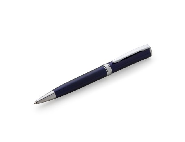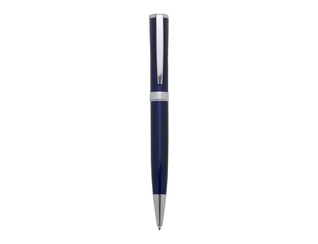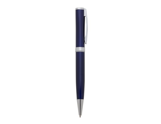 Caneta metal inteira colorida(pintura metalizada) com detalhes em prata, design executivo. Anel plástico e clip de metal, aciona por giro. Tamanho total aproximado (CxD): 14 cm x 1,6 cm. Peso aproximado (g): 27