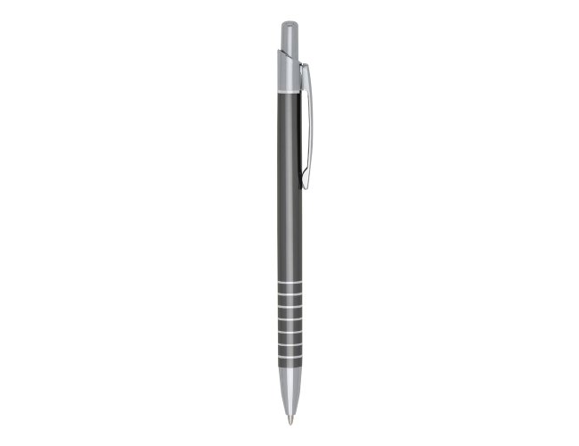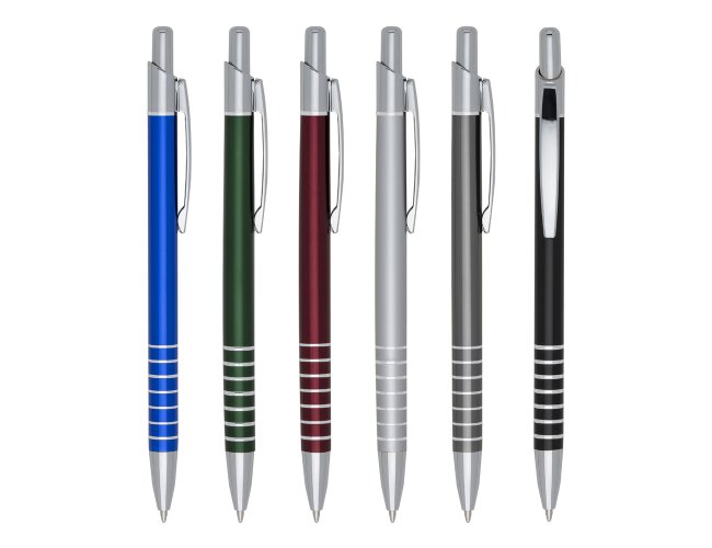 Caneta metal fina inteira colorida com detalhes prata. Clip de meta, possui sete anéis na parte inferior. Aciona por clique.