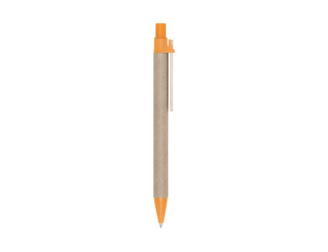 Caneta ecológica de papelão com detalhes coloridos. Clip de madeira e ponteira plástica, possui relevo na ponteira. Aciona por clique.