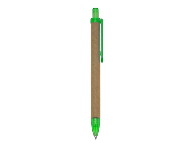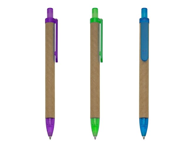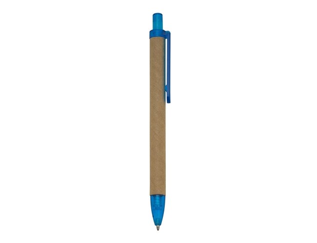 Caneta ecológica de papelão com detalhes em plástico translúcido. Aciona por clique, carga esferográfica na cor azul.