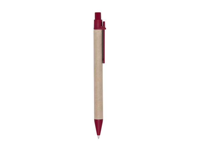 Caneta ecológica de papelão com detalhes coloridos. Clip e ponteira plástica, possui relevo na ponteira. Aciona por clique. Medidas aproximadas para gravação (CxD): 3,7 cm x 0,7 cm.