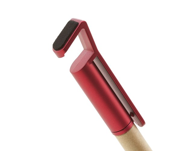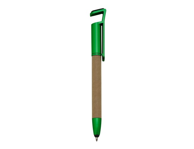 Caneta ecológica touch com suporte para celular, corpo de papelão e detalhes em plástico. Clip aberto utilizado como suporte para o celular e parte superior com limpador de tela. Aciona por giro, carga esferográfica na cor azul.