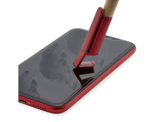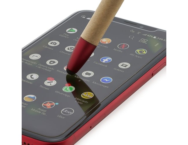 Caneta ecológica touch com suporte para celular, corpo de papelão e detalhes em plástico. Clip aberto utilizado como suporte para o celular e parte superior com limpador de tela. Aciona por giro, carga esferográfica na cor azul.