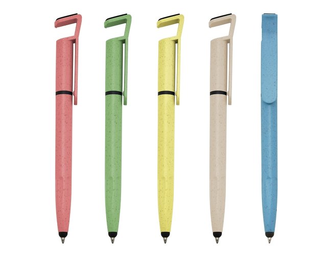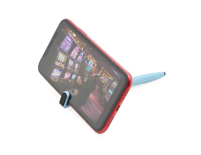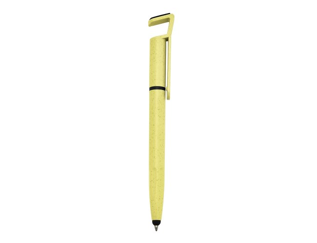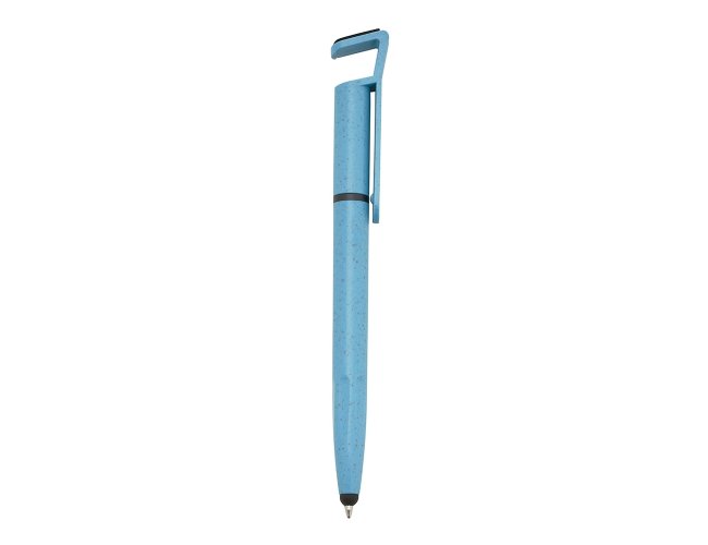 Caneta fibra de bambu touch com suporte para celular. Clip aberto utilizado como suporte para o celular e parte superior com limpador de tela. Aciona por giro, carga esferográfica na cor azul.