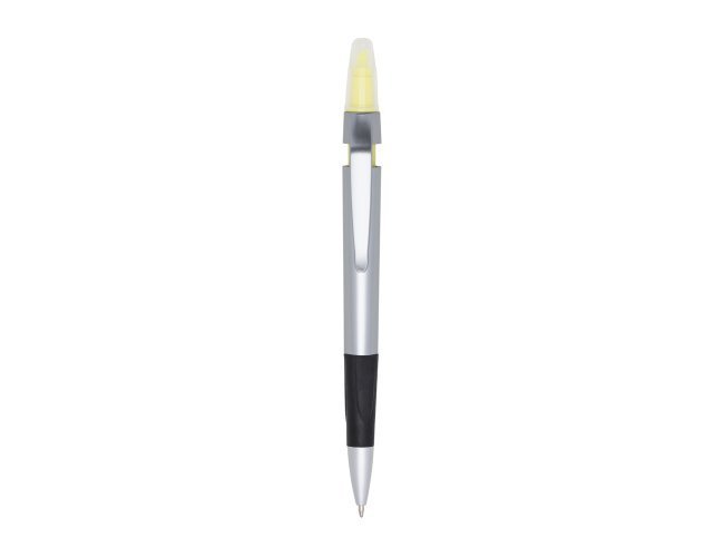 Caneta plástica esferográfica e marca texto com corpo prata. Possui tampa protetora no marca texto e detalhe emborrachado com relevo na parte inferior. Aciona por clique.