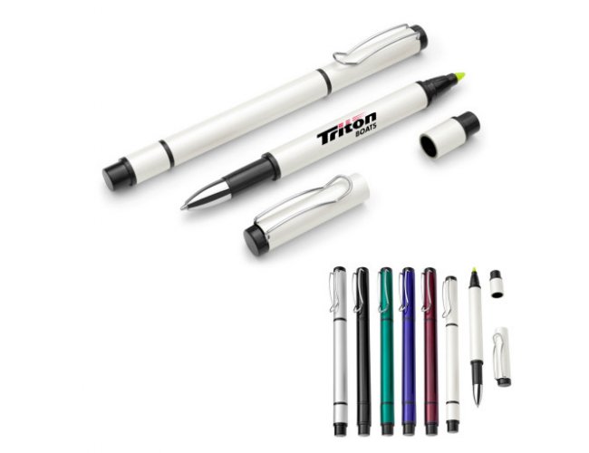 Caneta metal marca texto inteira colorida com detalhes preto. Clip de metal na cor prata, possui tampa em ambos lados(esferográfica e marca texto). Marca texto apenas amarelo. Tamanho total aproximado (CxD): 13,9 cm x 1,3 cm. Peso aproximado (g): 17